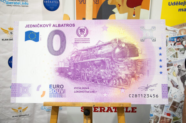 The express steam locomotive 498.1, nicknamed the “Albatros one”, holds the official Czech-Slovak speed record for steam locomotives at 162 km/h. The motif, which appeared on a new 0 euro souvenir banknote and a couponed stamp issued by Czech Post, was created by artist Petr Ptáček, who willingly signed autographs for collectors.